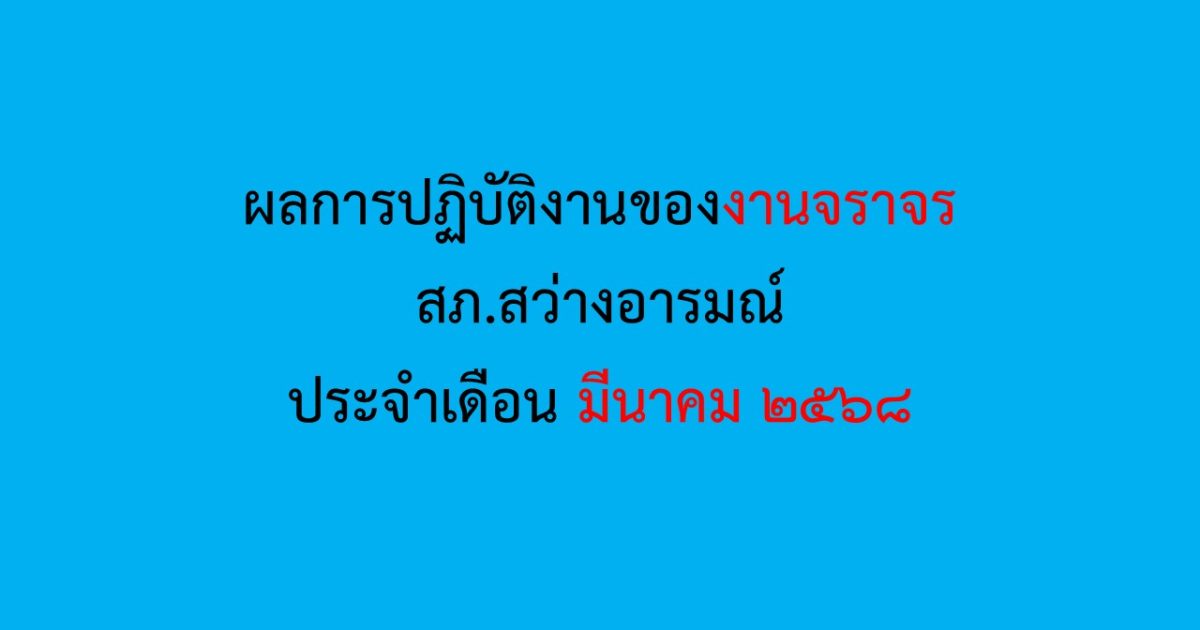 งานจราจร 31 มีนาคม 2568 โดย admin / ผลการปฏิบัติงานของแต่ละสายงาน,ผลการปฏิบัติงานของแต่ละสายงาน,มีนาคม 2568 ผลการปฏิบัติงาน เดือน มีนาคม 2568 (งานจราจร)ดาวน์โหลดPDF ผลการปฏิบัติงาน เดือน มีนาคม 2568 (งานจราจร)ดาวน์โหลดWord