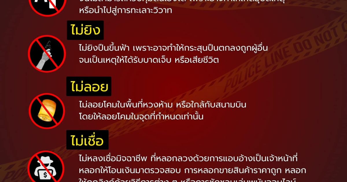 สำนักงานตำรวจแห่งชาติ จึงขอแนะนำ “5 ไม่ ปีใหม่” ส่งท้ายปีเก่า เพื่อให้พี่น้องประชาชนระมัดระวังการกระทำที่อาจก่อให้เกิดอันตรายกับบุคคลอื่น และอาจเข้าข่ายเป็นความผิดตามกฎหมาย รวมไปถึงระวังภัยจากมิจฉาชีพที่อาจฉวยโอกาสก่อเหตุในช่วงเทศกาล ดังนี้