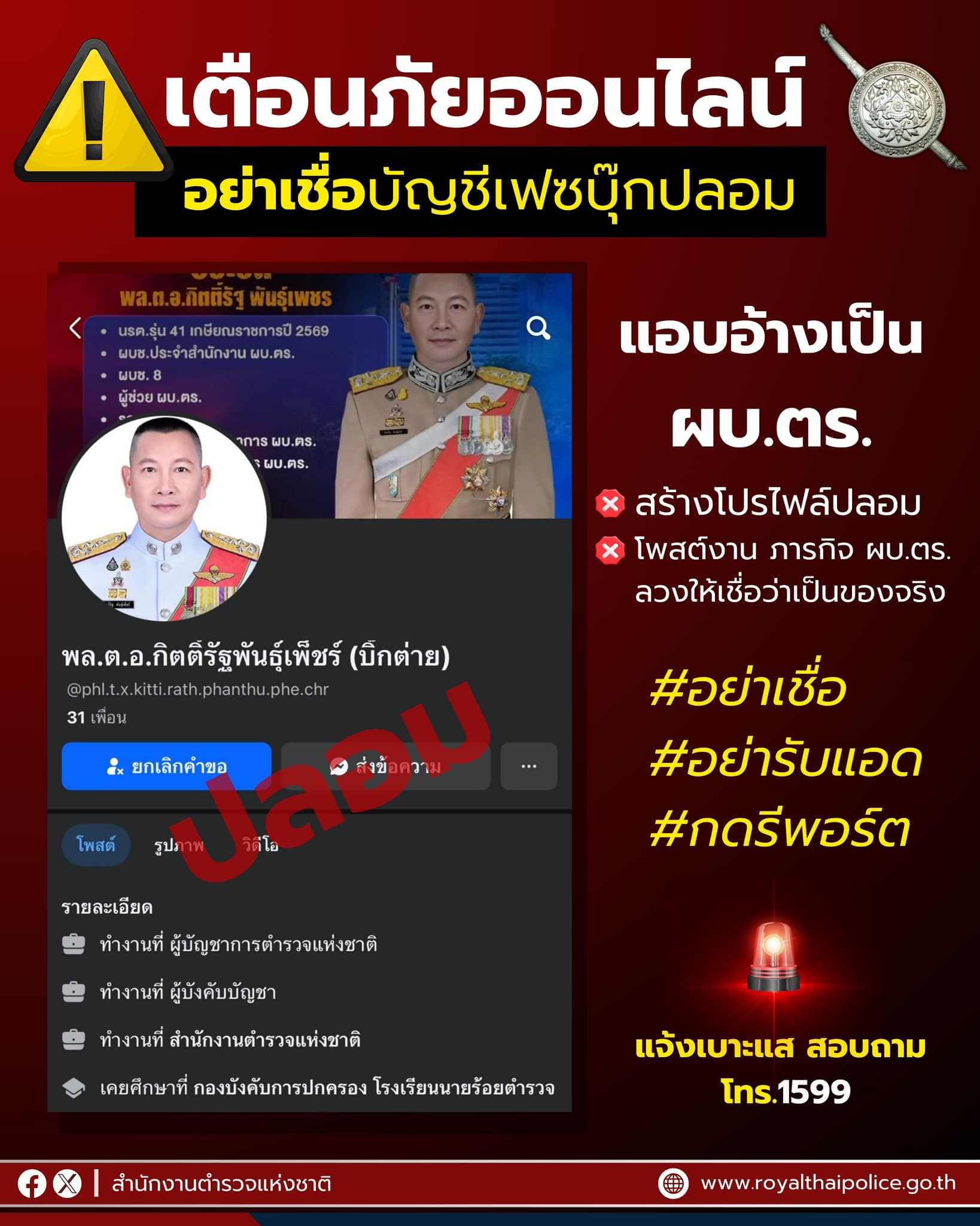 อย่าเชื่อ อย่ารับแอด กดรีพอร์ต “บัญชีเฟซบุ๊กปลอม” แอบอ้าง เป็น ผบ.ตร.– สร้างโปรไฟล์ปลอม–