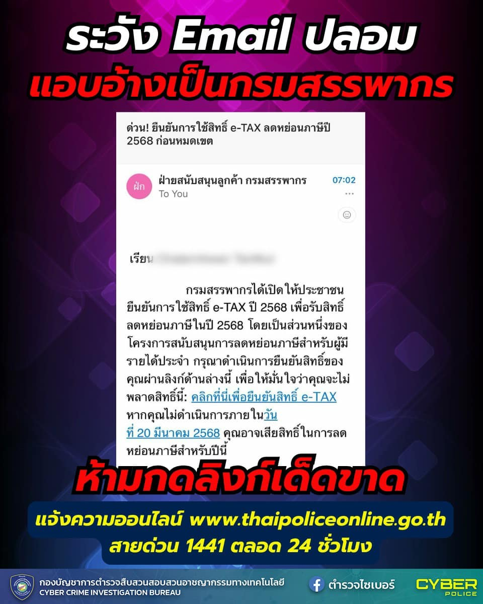 ขอให้ทุกท่านระมัดระวัง! ช่วงนี้มีมิจฉาชีพที่ส่งอีเมลแอบอ้างเป็นสรรพากรเพื่อหลอกลวงผู้คน โดยจะแจ้งว่า